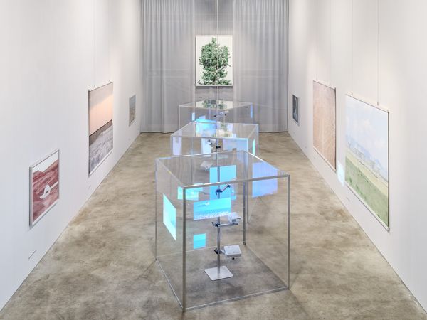 The collected images are projected as temporary, choreographed and layered constellations onto transparent cubes, flowing past the expansive landscapes and staged architectures in Orejarena & Stein‘s photographs like swarms of viral hallucinations. The archive sculpture reflects Orejarena & Stein‘s ongoing exploration of visual practices online and their dynamic archives as a collective subconscious.