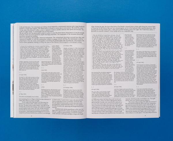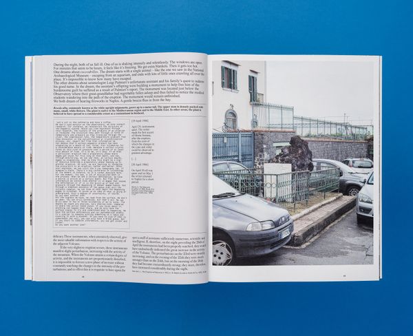 Amidst the fire, I am not burnt is an experimental documentary approach of the iconic landscape shaped by Mount Vesuvius. The April 1872 eruption – the first volcanic eruption ever photographed – is the starting point: a violent cataclysm causing devastation and death. Four major eruptions have followed since, with the next eruption dangerously looming. ‘Surface Reading’ researches the different temporalities, scientific and popular approaches, historic and present-day photographic representations, and stories inscribed in the landscape. It interweaves documentary writing and photography in a constellation of subjects ranging from the historic and present-day observatories, breadcrust bombs, a parking lot inside the mountain, Neapolitan outskirts, superstitious residents, derelict quarries, antennas, chunks of lava, souvenirs, a muon tracker, marble plaques, twelve students that perished near the crater, vegetation, archaeological sites, government workers around a bonfire and lovers parked along the nightly road leading up the volcano.
