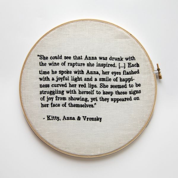 Selected citations are machine-embroidered onto coarse meshed linen fabric, traditionally used for hand embroidery. Mirroring the gendered needlework assigned to the female characters, yet adapting the work to our present time, where machines have replaced most manual chores.