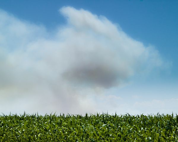 The titles of the pictures are divided into types: fields, landscapes, people's names, nouns. Field #2 and Field #3 are a nice pair; #2 is an idyllic shot of a green field bursting with tiny white flowers (the famous Idaho potatoes) under a blue sky; #3 is a dose of artifice that's more real. What looks like plain old grass reflects an almost neon sheen as a stream of fertilizer falls on it, the stream stretching across the top of the picture like a coal-dust rainbow. The scale is unsettlingly unclear, as in Landscape #13, a picture of toy trucks in a tilted sandbox that, because of the angle, look about to drive onto the real highway above them.