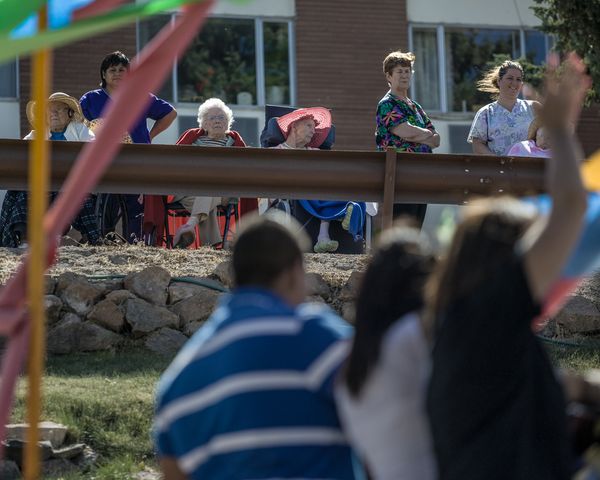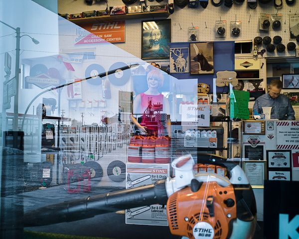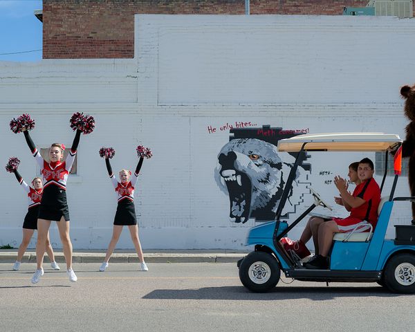 An old woman and a young man wait for a parade—we see only their backs and the empty street. Two horses lean into the picture frame, a row of electrical towers standing between them—their replacements. High-school cheerleaders perform overly enthusiastically in front of an anti-drug mural of a snarling dog ("he only bites...meth consumes!"). A karaoke stage waiting for a singer is backed by American flags, as if singing in someone else's voice were the national art form.