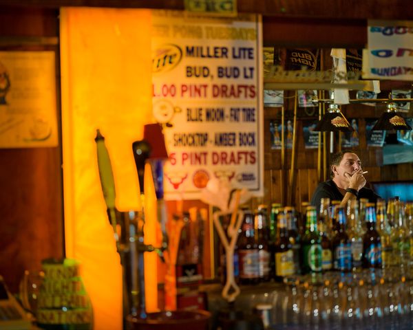 Davis's photographs cover a wide range of approaches to documentation, even self-consciously so. The crisp right-hand half of Davis's photograph of a man sitting alone at a bar with his beer and cigarette could be a stock image in any hard-luck series. But on the left-hand half of the picture, the image dissipates into pure light and reflection, sliding into soft oblivion, or escape. The obdurate brick surface of the bar is seen in another picture, a deadpan portrait of its exterior under a gray sky.