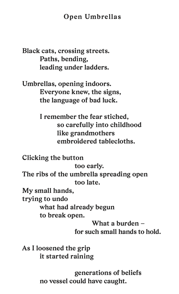 This book is not a study in folklore, but a personal archaeology, a way of digging into the soft ground between past and present, culture and control, tradition and autonomy. Superstition, I’ve come to understand, is not only about sprinkling salt over the shoulder or avoiding certain actions. It’s also about silence. About knowing your place. About learning not to speak too loudly, or want too much. And perhaps, more importantly, it is about unlearning all of that.