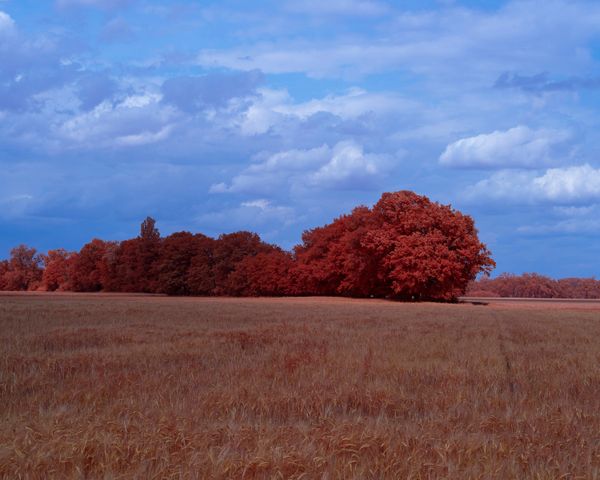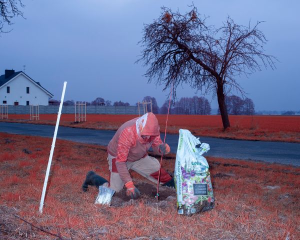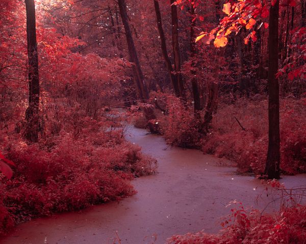 These practices become a metaphor for hope — an attempt to restore the relationship between humans and nature through mindful care for the land. Infrared photography transforms green into red, creating an unreal landscape while simultaneously alerting us to loss and its scale.