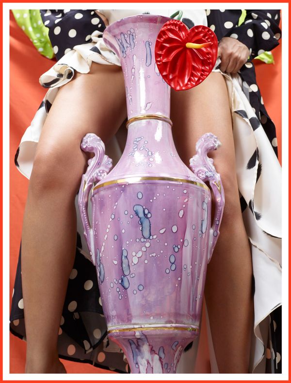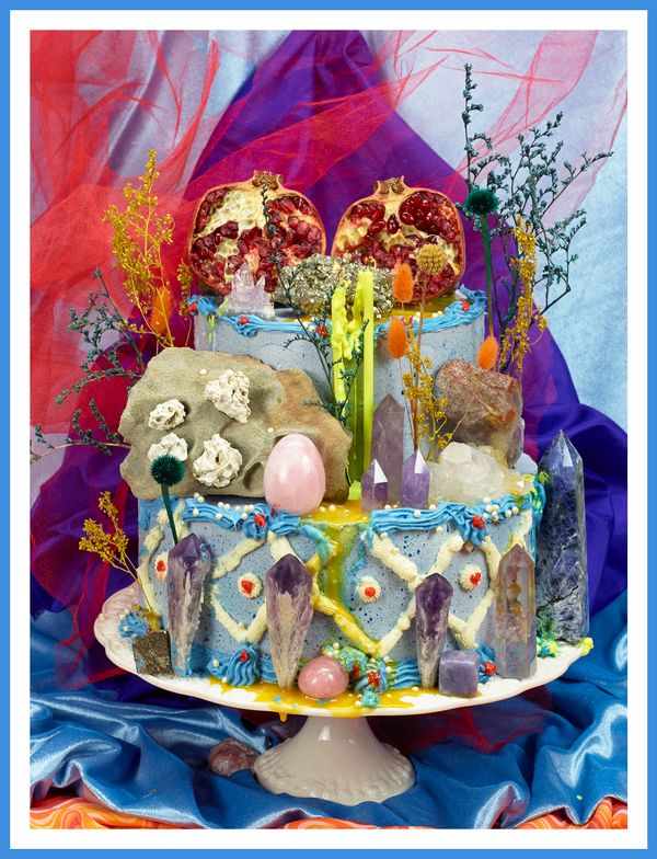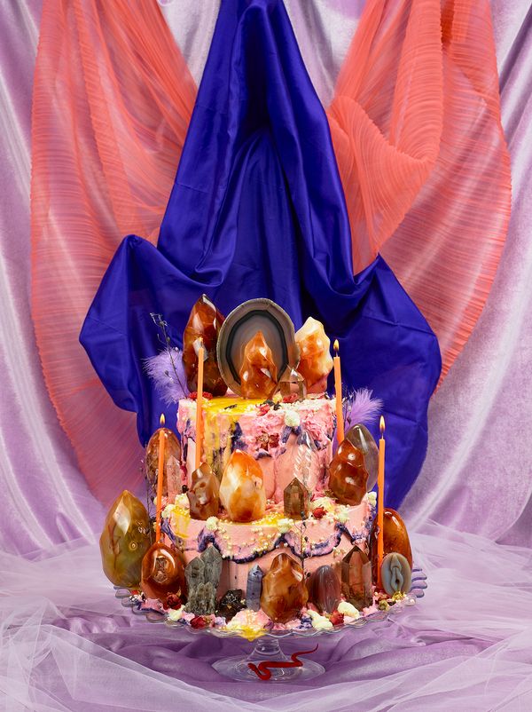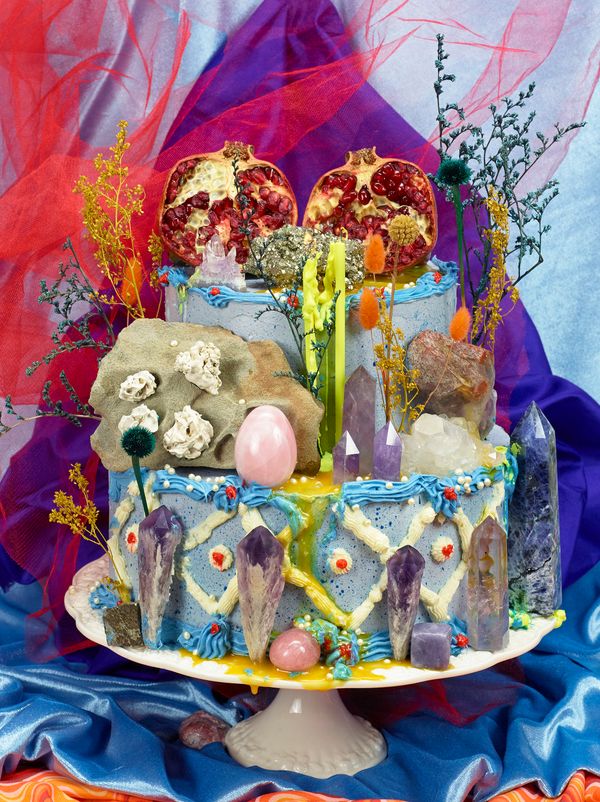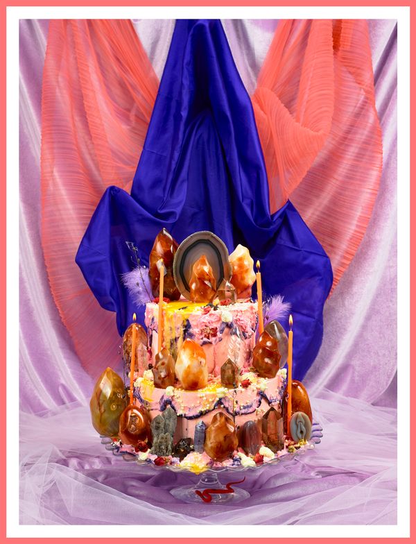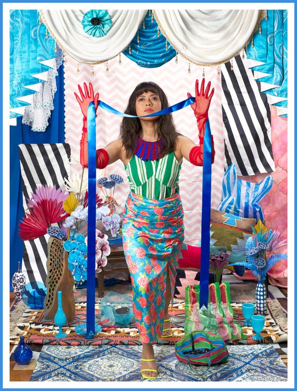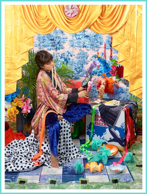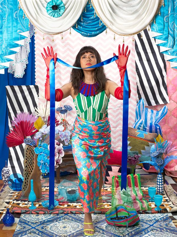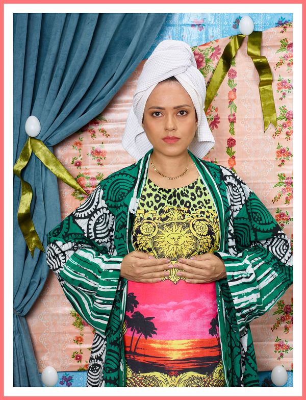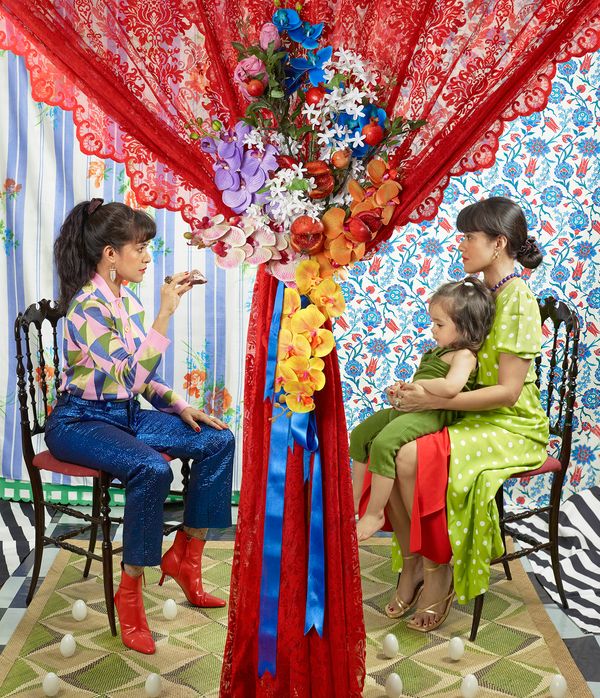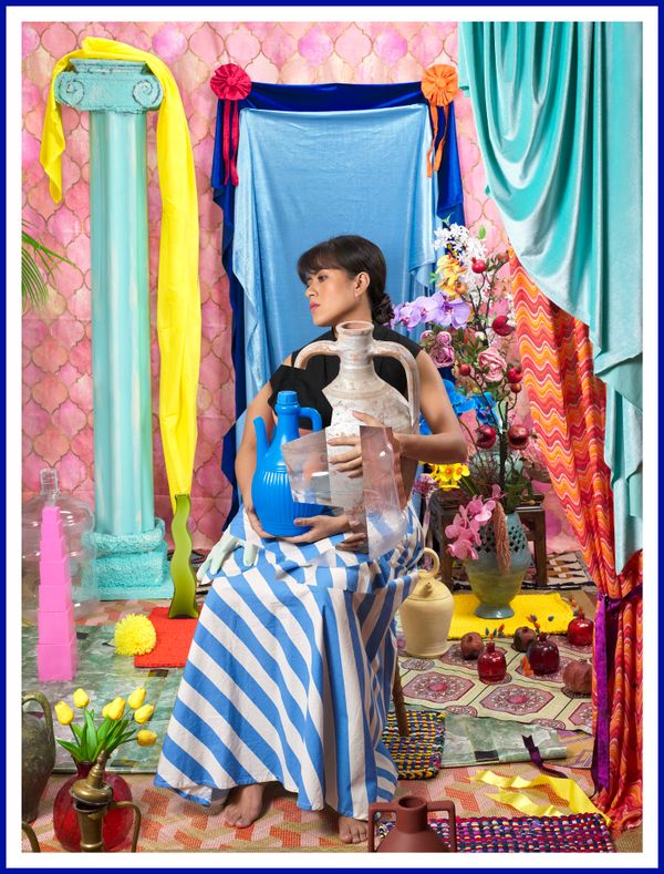 “This latest collection of self-portraits by Wawi Navarroza continues the artist’s vivid, layered explorations into identity, place and belonging, with a specific focus on the female experience, motherhood and transformation. This body of work marks a particularly transformational period for the artist in which she has become a mother and moved across the globe from Manila to Istanbul, a country which sits on the cusp of Asia and Europe, the ancient and modern world. Though both experiences were destabilising in different ways, the artist chooses to reflect on how they have enriched her perspectives of the world and renewed her connection to both her body and art. There is a distinct celebratory atmosphere throughout: in the riotous melding of colour, pattern, texture… and in the depiction of birthday cakes that refer to the birth of Navarroza’s child but also her own rebirth as a mother.