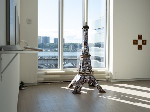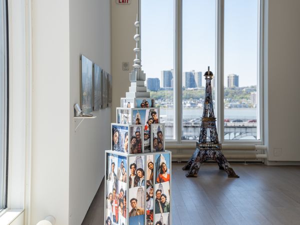 The project includes sculptures—towering replicas of the Eiffel Tower and Empire State Building adorned with fragile, AI-generated images printed on tracing paper—representing a time-traversing Tower of Babel that connects memory, travel, and imagination.