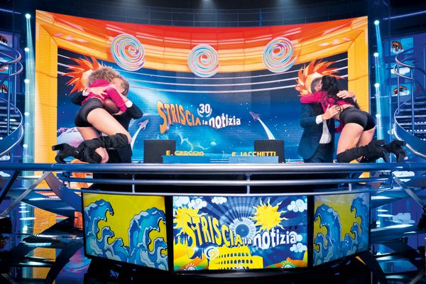 As a general term for these female characters, the word Velina has established itself among the population and even in Italian dictionaries. It comes from the satirical news show "Striscia la notizia", which is currently celebrating its 30th anniversary and has more than 4.5 million viewers every evening. This show is a success story for Mediaset, Italy’s largest private broadcaster, which belongs to Berlusconi’s media empire. Right from the start, the show has featured two Veline, who kneel on the moderators’ table after a short introductory dance.