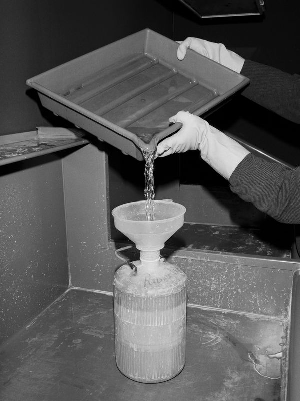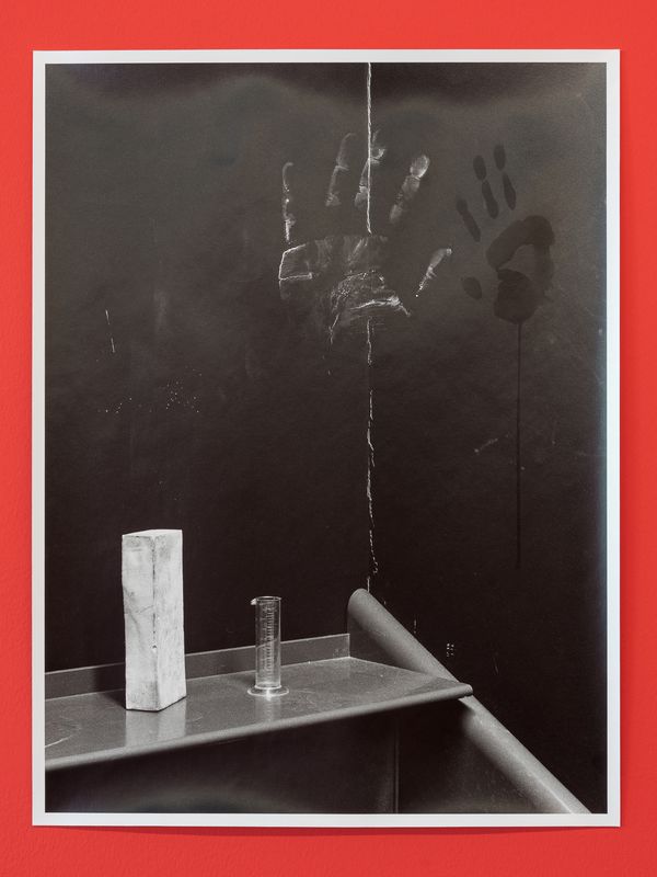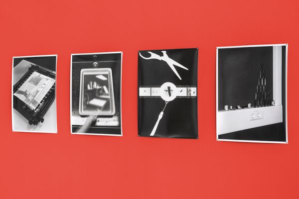 In Baryt 2.57, I focus on the production processes of analogue black-and-white photography and make them the subject of a photographic work. The darkroom becomes the place of taking and producing photographs at the same time. The tools, machines, utensils and, last but not least, chemicals flow into the photographic images, as do my personal objects. The otherwise invisible steps and processes that underlie the production of every analogue photograph are made visible. Latent intermediate results of darkroom work, such as film negatives or test strips, are thematised in the photographic image itself and provide an insight behind the scenes of the image production. Direct physical contact with the light-sensitive materials creates marks, traces and shadows that are inscribed in the photographs and reveal the close dialogue with photography that can take place in the darkroom.