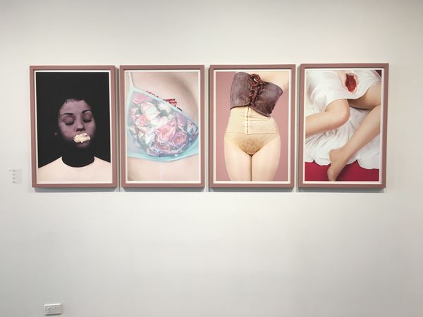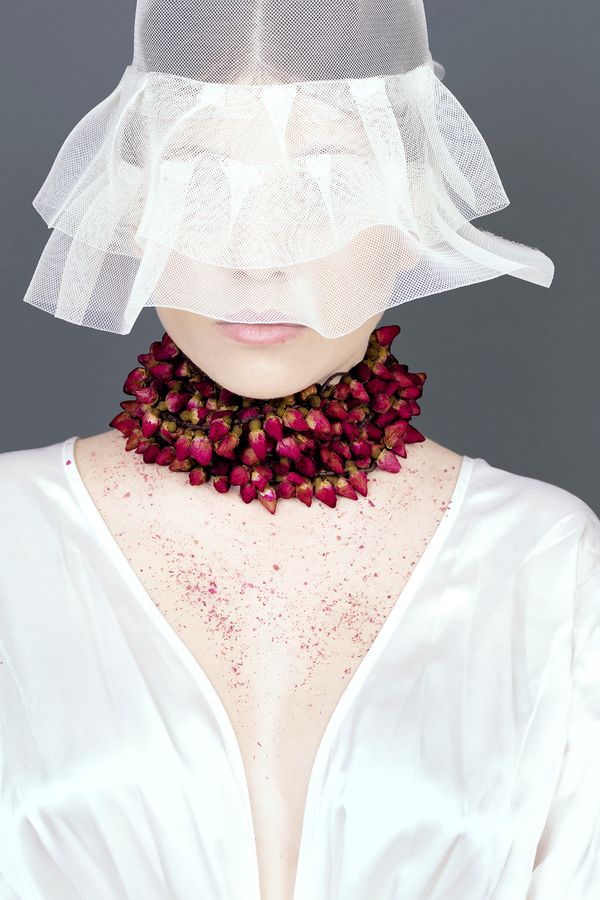 The photographs are made with soft studio lighting as a display of superficiality, very similar to what is found in beauty advertisements. The materials used in each photograph consist of different fabrics types; crystals beads and flowers that are carefully manipulated into shapes incorporating a dramatic effect just to illustrate the painful details of the process that one can call “attractiveness.” Color is fundamental to this body of work since I manipulated the colors with pink tones to emphasize the presence of the female character.