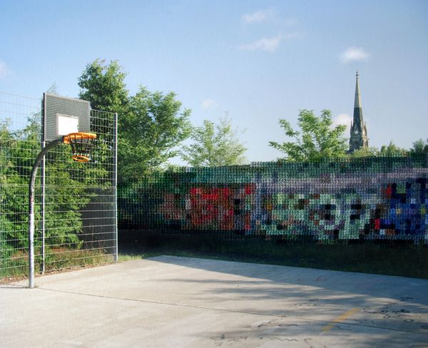 The images were taken in the city center as well as the outskirts of city where I followed the former path of the wall through suburbs and forests. I was particularly interested in photographing locations where no visible traces of the actual wall remain but where one can still see subtle clues of its previous existence. Often the embroidered sections of the image run along the horizon line forming an unnatural separation that blocks the viewer. This aspect of the sewing emphasizes the unnatural boundaries created by the wall itself.