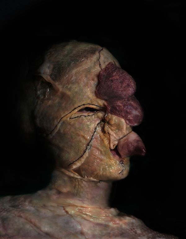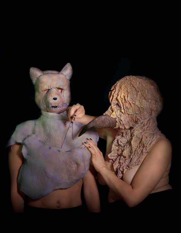 Photographic project made of self-portraits, in which, I build masks representing contemporary beasts based on words commonly used to denigrate women in whom the offensive word refers to a real or fantasy animal name, such as dog or slut, bitch, viper, dead fly, harpy, etc. The masks are made of skins, viscera and entrails of animals such as chicken, pig, fish, cow; which are used for food consumption. Materia that is subsequently sewn, embroidered or stapled and then photographed using my body as a support. I am interested in questioning that particular association that exists in Latin American language and culture where women and animals are associated as debasing. I work with post mortem raw material, animal remains that imply a serialised carnivorous consumption, detached from animal care: creatures deprived of affection and/or stripped from their natural conditions.