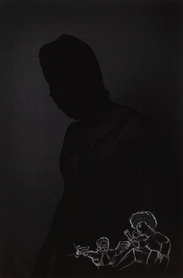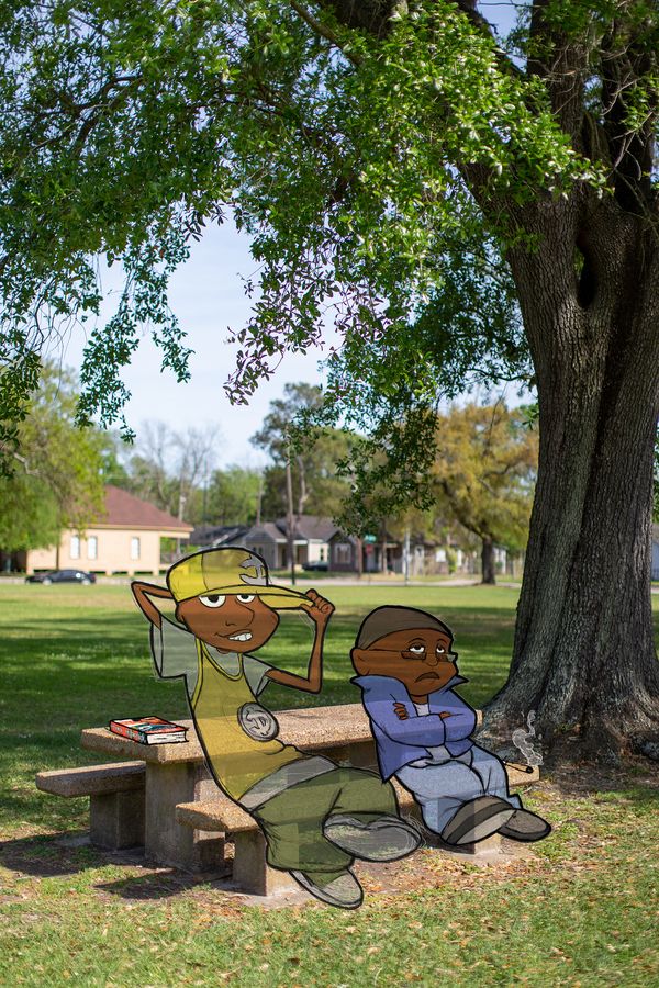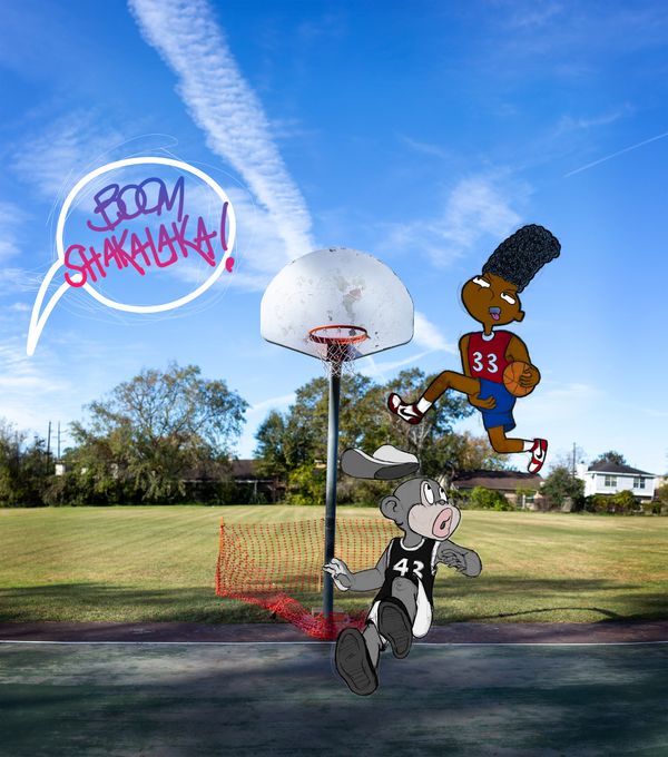 BLACK SNAFU (Situation Niggas: All Fucked Up), gets its name from “Private Snafu”, a series of cartoon shorts made in the 1940s by Warner Bros. in the hopes of educating American WWII soldiers about military and warfare tactics. In BLACK SNAFU, I appropriate various depictions of Black people that I find throughout the history of American cartooning and beyond—from the 20th century racist characters in Don Raye’s “Scrub Me Mama with a Boogie Beat” to more contemporary, uplifting, and pro-Black characters like Huey and Riley Freeman from Aaron McGruder’s “The Boondocks”—and juxtapose them with photographs that line up more authentically with a (my) Black experience. These photographs are made by my hand and come from my camera, allowing me to fight back against the historical racist tropes I reference with my own authentic Blackness. By combining these ambivalent visual languages, I intend to expose to viewers America’s deplorable connection to anti-Black tropes through pop culture while simultaneously celebrating the reality of what it means to be Black.