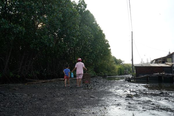 Each year, Sayung’s shoreline retreats by several meters. Houses turn into boats, rice fields become salt ponds, and village roads now lie beneath the sea.