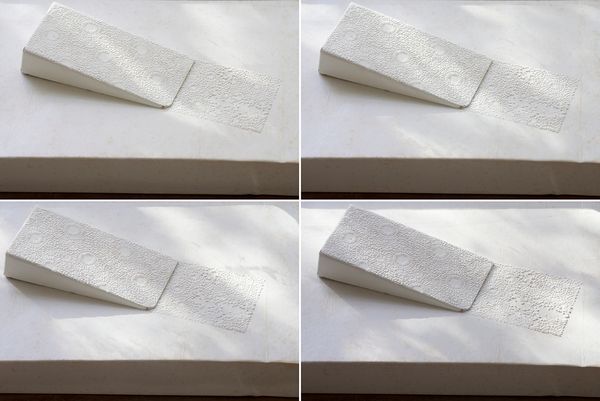 Despite these weighty issues, there is playfulness embedded in the very title Buttons for Eyes. I am imagining what we might see with our button eyes; suggesting that seeing clearly calls for seeing the world in more unusual ways. Play occurs in this work in my use of both color and natural light. These are materials to manipulate; split into sparks, smear into rainbows, and find shimmering back from the depths of powdered pigments. In this series my concern for the past that is lost to me is apparent, but so is my concern for the future and the losses that will come. And although this work mythologizes the past and present it also plays games with them. It winks, pokes and inverts - suggesting joyousness - mixed with the loss and regret that accompanies us all.