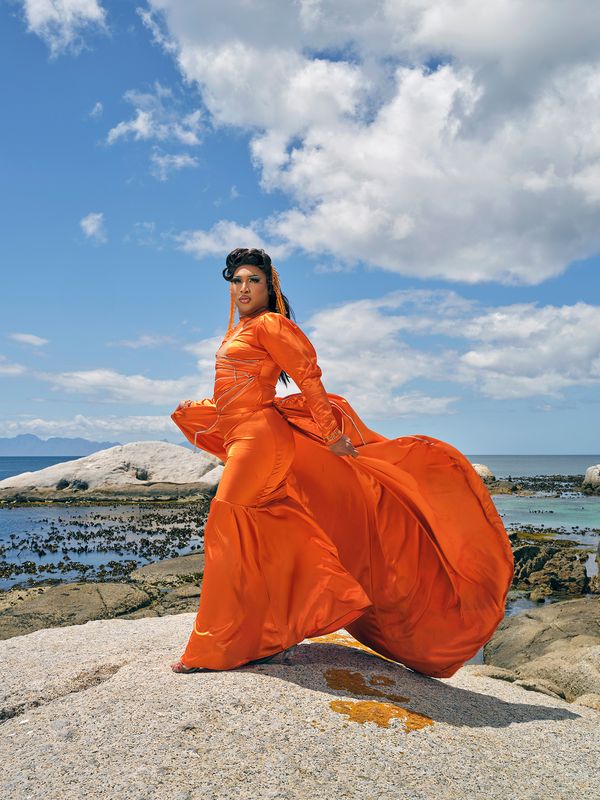 For the 2019 pageant edition, in an homage to the 1994 road comedy The Adventures of Priscilla, Queen of the Desert, Chedino and I spent a day photographing the contestants on a salt pan outside of Cape Town. In 2022, inspired by the iconic seaside embrace between Deborah Kerr and Burt Lancaster in the 1953 classic From Here to Eternity, we took the group to Windmill Beach, in Simon's Town.