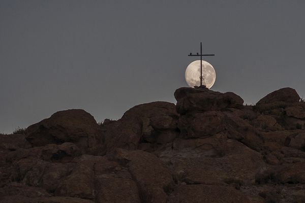 Mountains are there still alive, with a cross on top and maybe moving.