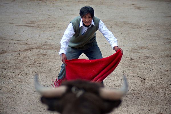 Bulls come into the scene, pushed from one to meet improvised bullfighters, willing to take out a band with silver coins fastened to the animal's horns.