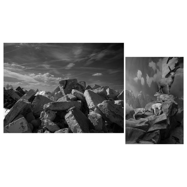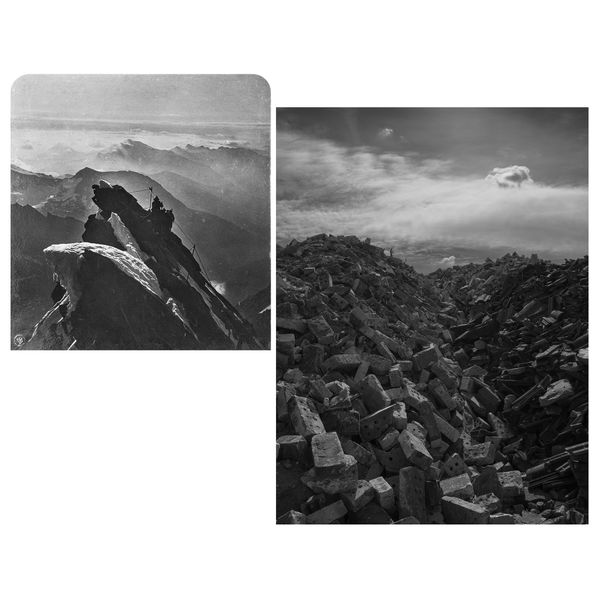 Equipped with these thoughts, the journey started. The camera's eye no longer shows the rubble; it presents the mountains, ascents and peaks. Combined with found imagery of climbers and alpinists, the story evolves. The pairs of images form a fictional adventure. It is a time travel back to childhood, its readings and stories, and the rediscovery of imagination. To quote German author Michael Ende: »Mehr Fantasie wagen« (»Dare more fantasy«).