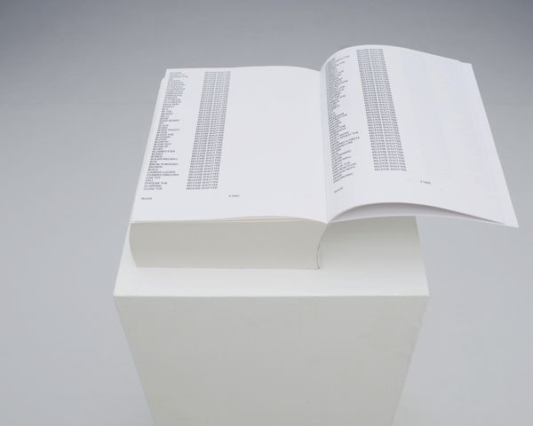 Installation of a large white box lit by 20 neons lights hanging on the upper wall. Inside the box, is presenting a large white book that collects 727 of the 3,000 self-portraits that the artist took in two months. The artist's self-imposed rules for taking these pictures were: “I am inside the box, I am dressed in white, I am barefoot and I can only release the shutter.” Container is a project about alienation in the relationship between the photographer and the apparatus. The camera is a black box in a white cube. The rules are the inputs and the images the outputs. These playful and at times disturbing self-portraits are a homage to Fluxus, the work of 1970s performance artists such as Vito Acconci and Bruce Nauman and a cruel reminder of our constant and exhausting compulsion to use photography to prove we exist.