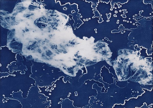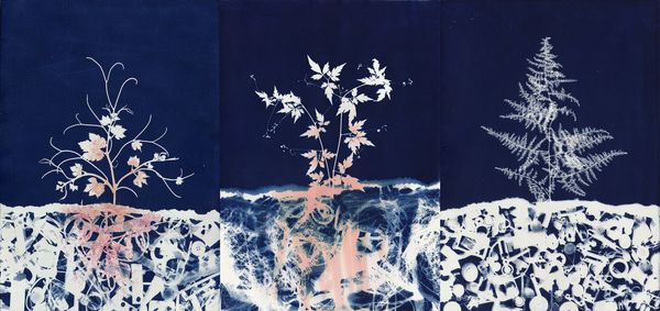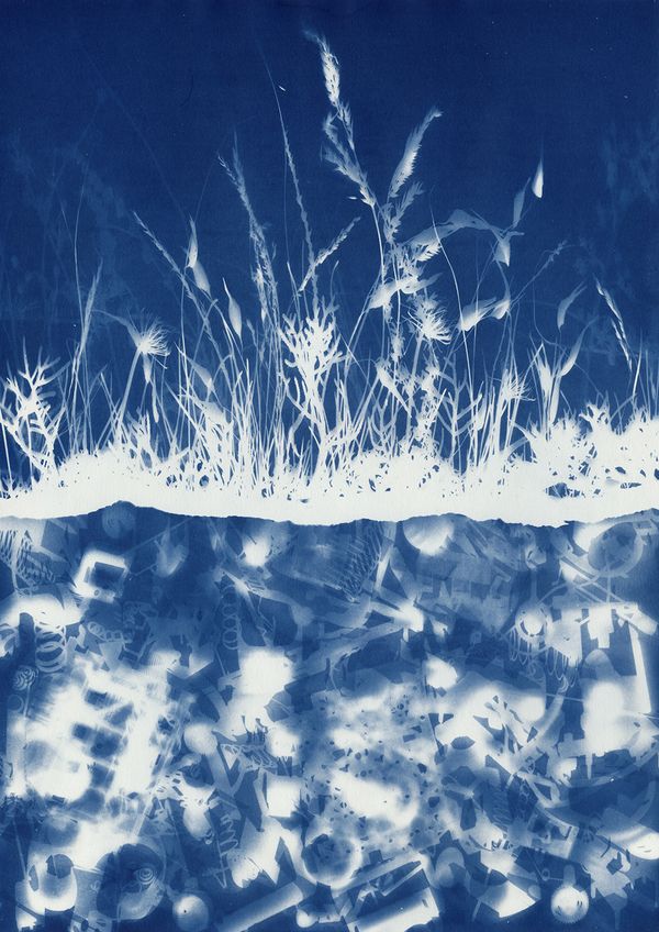 I created these cyanotypes-photograms to illustrate this dystopian post-human condition. I chose cyanotype as my medium in this effort for it is one of the least environmentally harmful methods of image production. The sun (whose UV radiation is required for the process), still hovers above bright and clear skies in my homeland. For how long, actually? I collected plenty of small useless objects (forsaken bits and pieces) from around my house, and others I found dumped along the streets, or in the surrounding countryside, such as bits of cellophane, plastic or paper packaging, synthetic fabrics, plastic bags, plastic and metal parts of machinery etc. I made the photograms with these.