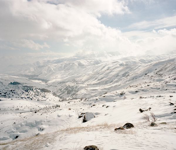 My grand-father Hayg, who came from Constantinople to Marseille around 1918, died when I was born, taking with him his history and the one of his family. Following the thread of a genealogical investigation, using old oriental directories, the Ottoman Bank archives or Facebook, which lead me to find lost cousins, I went to Armenia one hundred years later, in 2017. I went looking for visual elements echoing with my own imaginary. Born in Constantinople, my grand-father never saw oriental Armenia, the territory of what Armenia now is. This leads to the idea of an emotional and fantasized link to an unknown land. Ararat as the horizon, the armenian landscape is a land open for mythological stories and mysterious and intriguing sceneries. During a poetic wandering in the snowy mountains, I went looking for the features of my own family in the bodies and faces of Armenian men I photographed in the intimacy, seeking their long noses and their hairiness, building an imaginary album of possible faces.
