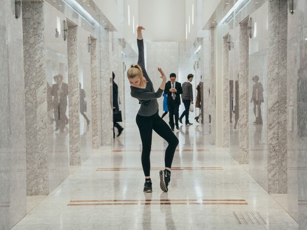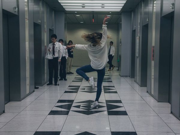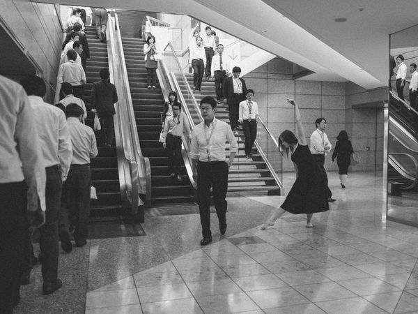 I enjoy to create an interaction between these two groups. At the same time capturing short dance performances in office rush hours I can observe how people react to art. I feel that element of surprise is very important for this experiment, that’s why I always choose a new office building and start the shooting without any notifications. Most of the office spaces are publicly open but well equipped with security cameras. The guards are coming as soon as they see something unordinary. Usually I have 3 minutes to get the shot. I started this project in 2016 and it's still going on. The idea is to cover most of traditional Tokyo offices and business spaces.