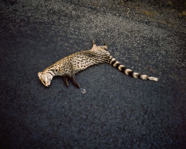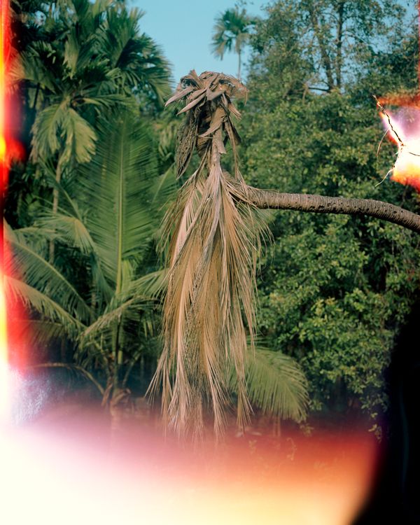 This alchemy between past and present added a whole new layer to Khedekar’s own evolving Dapoli project. In a homage to his predecessor, the younger photographer began to take photos of Kolekar’s photos and juxtapose these impressions against his original images. The result was a singular body of work that also bore the imprint of two very distinct sensibilities. Its energy comes as much from the inadvertent collaboration between the two men, as from moments of rupture that differentiate their styles. What we witness, as a result, in Khedekar’s Dapoli is a double vision, where scenes converge and diverge, becoming one and apart, as our eyes dwell over the sequence. Like ripples on water, a recurring imagery, the line between now and then keeps getting blurred. If in one photo, the accretion of patterns on a bark signals the weight of the years, then two men in another image offer a sharp contrast, radiating youth and health. In yet another spread, a frayed shirt hanging on a tree and a feline corpse on a highway thicken the spectral aura. The story of Dapoli is that of absence and presence, remembering and forgetting.
