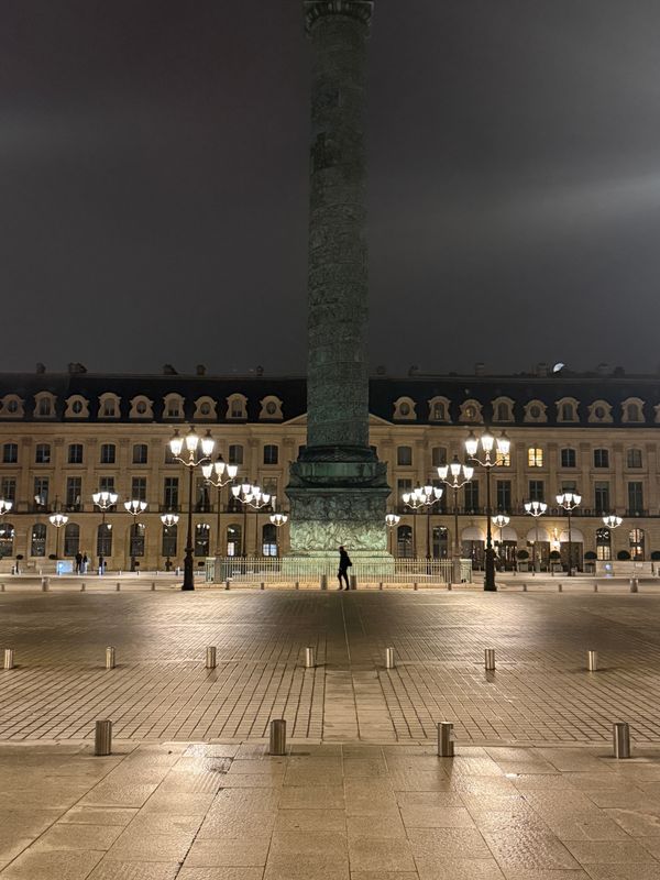 Green Axis, photographed at Place Vendôme, centers on the green-patinated Colonne Vendôme, surrounded by the square’s jewelry houses and anchored by the Ministry of Justice in the background. The column functions as a vertical axis around which power, capital, and history silently converge, rendered calm and neutral by the early hour.