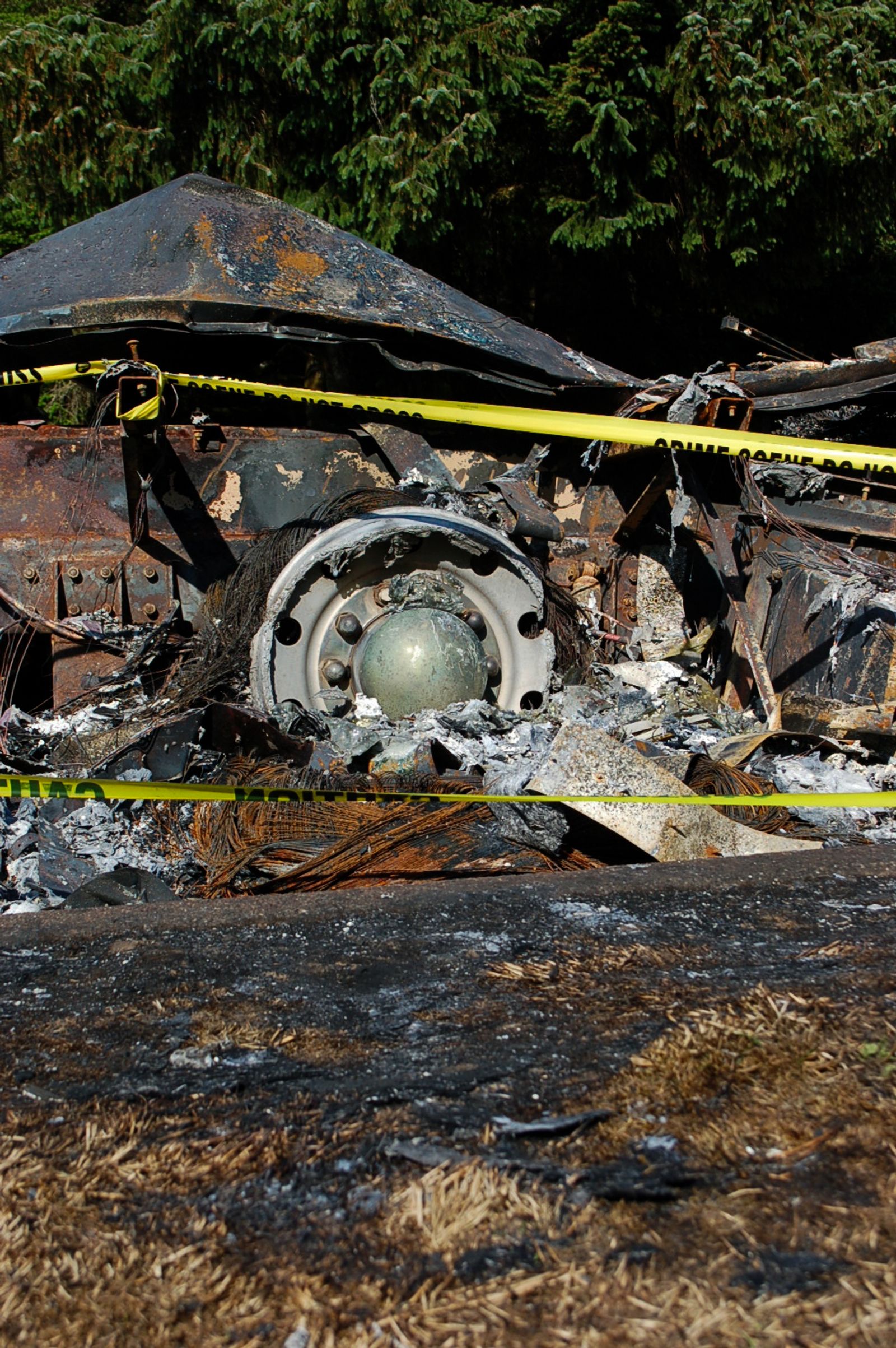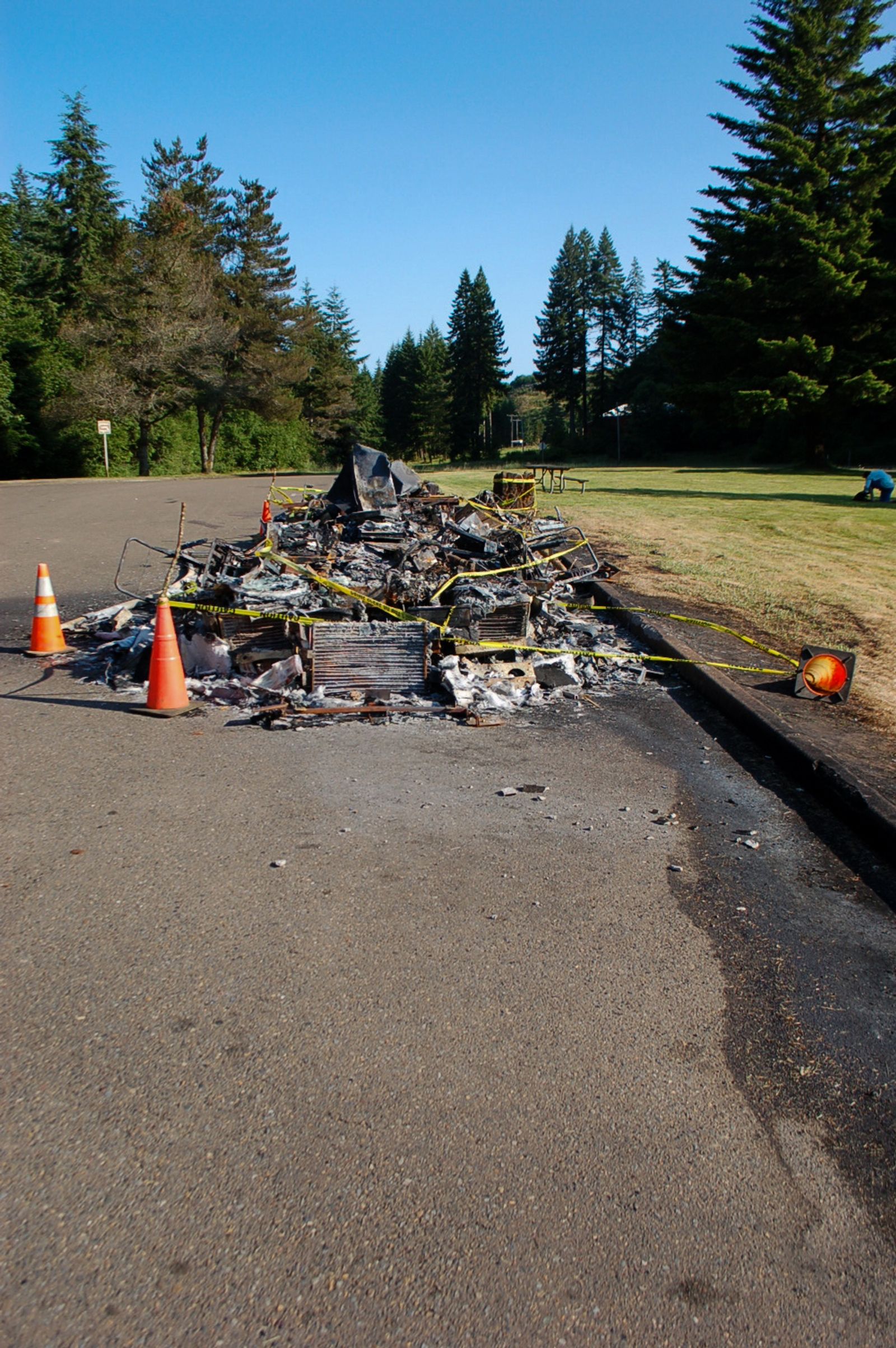 A road trip interrupted. Property destroyed. The aftermath on display for every passerby crossing Oregon's Coast Range from Newport after the Fourth of July. Circa 2012. Take a right turn into the green and forested rest area along Highway 20 in Benton County, Oregon to discover the twisted and burnt wreckage of a recreational vehicle's last stop. Don't step too close, the plastic police tape warns. Caution. This is a crime scene.