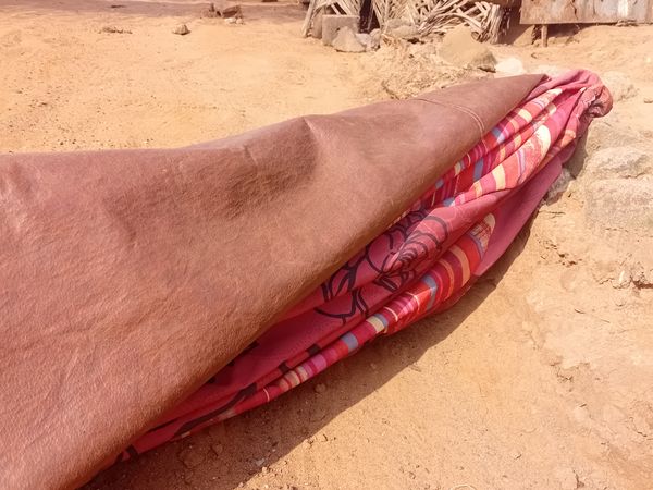 Constructed from second-hand clothing textiles imported from the Global North and locally reassembled become geometric abstractions. Pastel circles against sand create patterns that recall modernist painting, yet these "discs" are technologies protecting 150,000 vendors working 12-hour days in 28-35°C equatorial heat for €8-20 daily wages.
