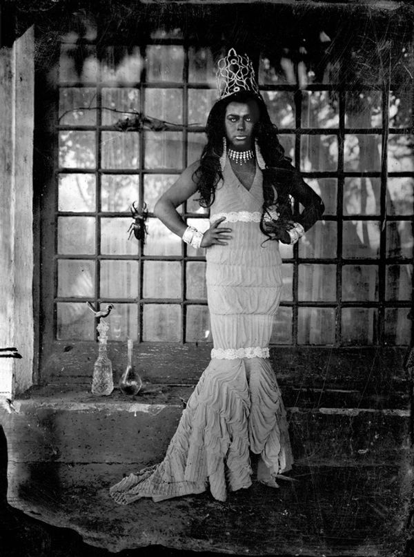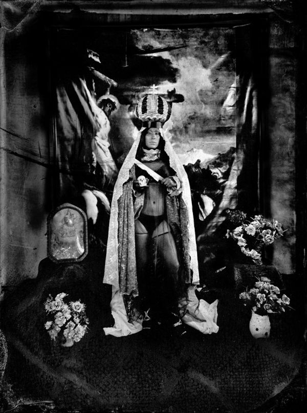 In Divine Image, contemporary virgins are seven and brunettes (related to the conquest of America), represented by transvestites, children suffering from a restrictive culture, symbols of self-sacrifice that to get the dark shed, be transformed, in a desired identity and postponed, sexy and provocative. Virgin undressed and lush neo baroque, who pose as goddesses and women wonder, the real superheroes of a religious culture conditioning.