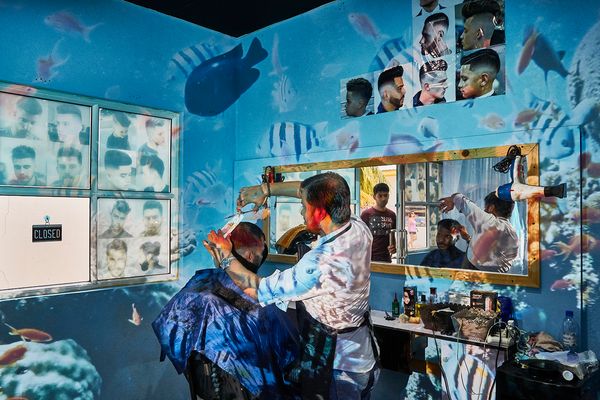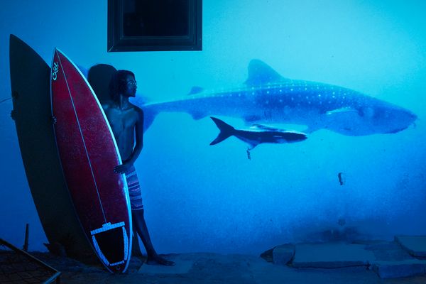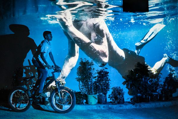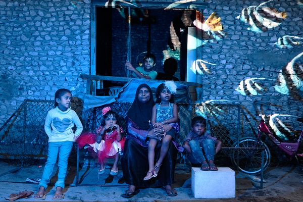 The Diving Maldives project is a journey on the islands inhabited just by Maldivians. We have collected a series of typical underwater photos taken by tourists and we have projected them as slides, in the streets and in the houses of the inhabitants of the different islands that we have visited. A real screening but, above all, a metaphorical projection of a not too distant future that looms over their daily lives.
