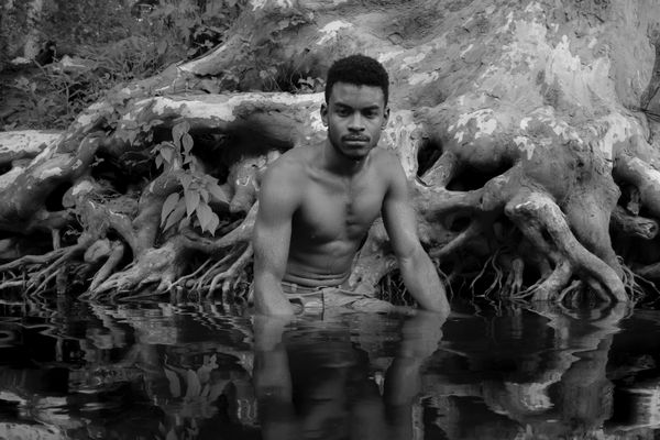 Faceless, but named, Taeshawn has his back to the viewer in what some might call a quiet refusal to be seen entirely. A decontextualized vision of solitude, his body occupies the center of the black and white composition. Framed by leaves surrounding him, Black man in boscage: are you still thinking of summer? Is the Hudson your refuge? Your heaven?