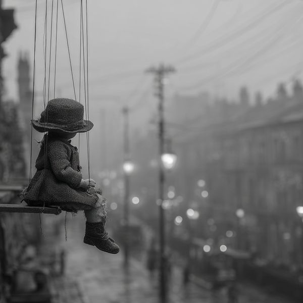Each image is conceived as a fragment of a universal emotional landscape. Figures are wrapped in plastic, pressed against glass, or frozen in gestures of despair — metaphors for suffocation, isolation, and the loss of agency. A marionette suspended in a monochrome world recalls the forces that control us, while fractured glass becomes a symbol of silence breaking apart. None of these portraits are about individual identity; instead, they become archetypes of collective human states — fear, despair, exhaustion, and the will to endure.