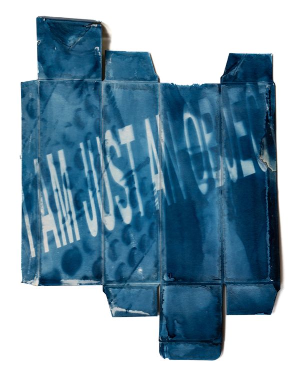 Embodied Experience: HUQ I Seek No Favor is an ongoing series of nude portrait collage cyanotypes representing my personal struggle of being born with a female body, wanting an equal, autonomous, body positive life, & the realization none of that is possible in this lifetime. Inspired by Barbara Kruger, Anna Atkins, Robert Mapplethorpe, these pieces are constructed using photographic practices on a continuum using historical photographic practices all the way up to digital photographs and digital negatives. These digital photographs are composites of birth control pills, nude self portraits, etc are converted into large format digital negatives (8.5x11 up to 36"x60"), and composited and then collaged with symbols of womanhood such as pregnancy sticks, condoms, etc... made into cyanotype images made with the sun and water, and are presented mixed with testimonial experiences in text and audio.