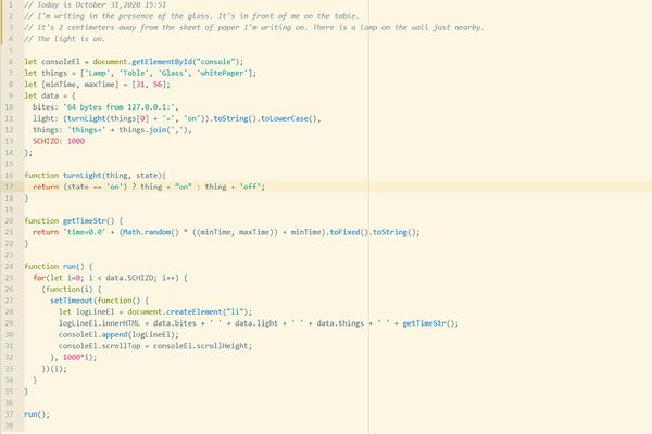 I work in the auto-fiction genre and create a fiction character, reassembling my personal experience (self-isolation for five years and online-life mainly) and a similar experience of a close friend who was diagnosed with the similar symptoms. In shooting we act as models, use personal belongings and the space of my house as a location. With the help of my friends-programmers who share the idea of the project, I artistically rethink the computer code: each phrase - “symptom” of the heroine * - is framed by the current code, which is connected with them through the plot and design, the logic of the function corresponds to the meaning of the phrase: stop, break - schizophrenia; recursion, looping, etc. - psychosis.