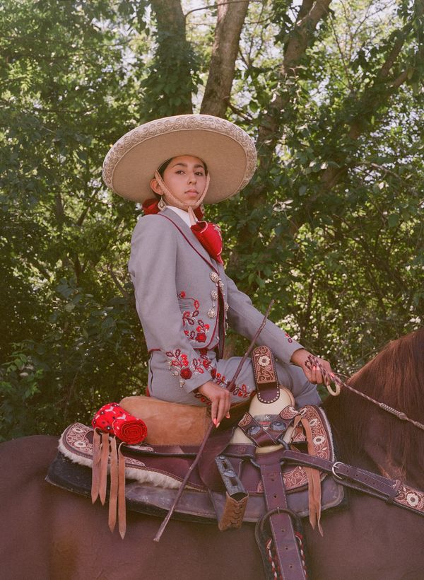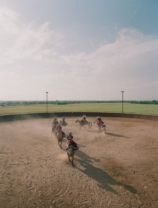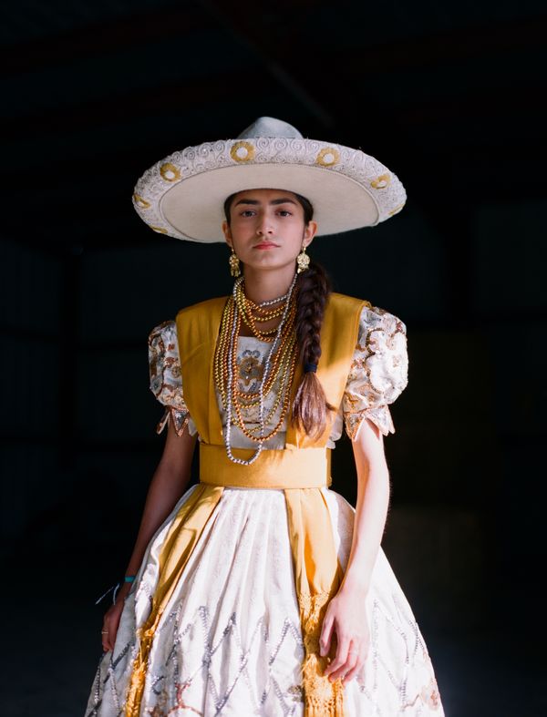 Over the course of a year, I photographed and interviewed teams across the United States. The interviews were in turn used by poets Ire’ne Lara Silva and Angelina Saénz in the creation of a collection of poetry to accompany the photographs in an upcoming exhibition in Texas. The escaramuzas speak of the sometimes-frustrating machismo that they have to navigate within their sport. In my photographs I seek to respond to this frustration, to capture the grace and dignity of these women, while reckoning with the gendered complexities of escaramuza within the charrería tradition. Notably, all the women are photographed in formal escaramuza dress—ornate and handcrafted garments that are in many ways emblematic of the social and cultural dimensions, as well as tensions, in their stories. They present themselves formally, and in this sense suggest a certain rigidity and strictness within the tradition. But this formality also describes the escaramuzas’ immense discipline, skill, and precision as riders. Moreover, the beauty of their garments is celebratory and expressive, speaking to the individual and their subjectivity, as well as to the profound sense of belonging that the tradition of escaramuza collectively holds for its practitioners.