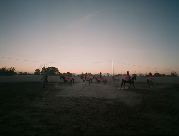 Escaramuza, The Poetics of Home considers the Mexican tradition of escaramuza, all-female precision horse riding teams who execute exacting maneuvers while riding sidesaddle at high speed and wearing traditional Mexican attire. Widespread in Mexico, escaramuza is becoming increasingly established in the United States. The predominantly male national sport of Mexico, charrería emerged from early Mexican cattle ranching activities and was eventually refined and formalized during the post-revolutionary era as a romantic, nationalist expression of lo mexicano (Mexicanness).