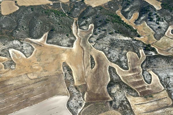 Vision of the world from above flying over the Desierto de los Monegros (Spain) according to an abstract key. Imaginary animals, plants, characters, made from the contrast of rugged mountains with cultivated fields, just after harvesting.