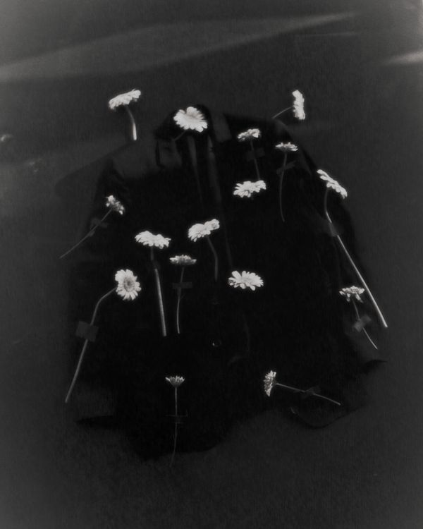 Flowers placed on skin, or against a black garment resembling a social uniform, act as shifting symbols. They move between tenderness and defiance, decoration and protection, suggesting identities that are neither fixed nor fully revealed. In this space, vulnerability becomes a deliberate act—one that challenges the expectation of coherence or legibility.