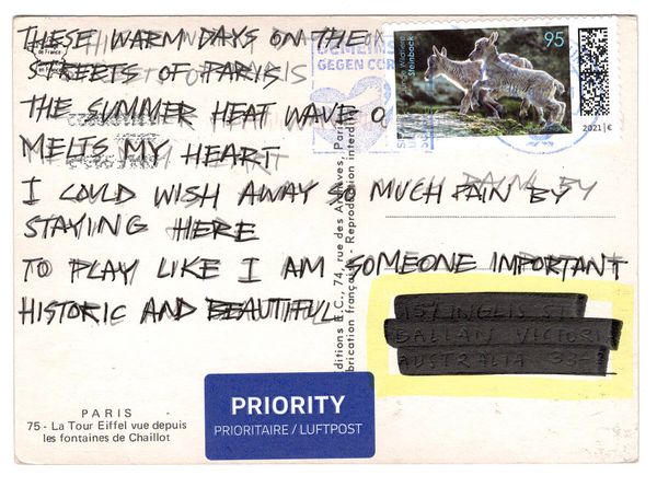 As I furthered my travels, I began collecting postcards and writing poetry to compliment my photographs. As a response to my experience, I wanted to represent the more idyllic and challenging aspects of the trip. Postcards tend to represent the idyllic travel moments due to their often saturated colours and recognisable iconography. By contrast the Inclusion of my handwritten poetry on the back of each postcard allowed for a more authentic honest, intimate, and sometimes sombre depiction of my travels. The combination of my photography, poetry and collected postcards represent a physical, emotional, and artistic tracing of my travels.