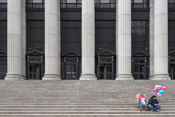 People here are not portrayed as individuals but as anonymous figures against the larger backdrop of their urban environment, together providing meaning to the scene.