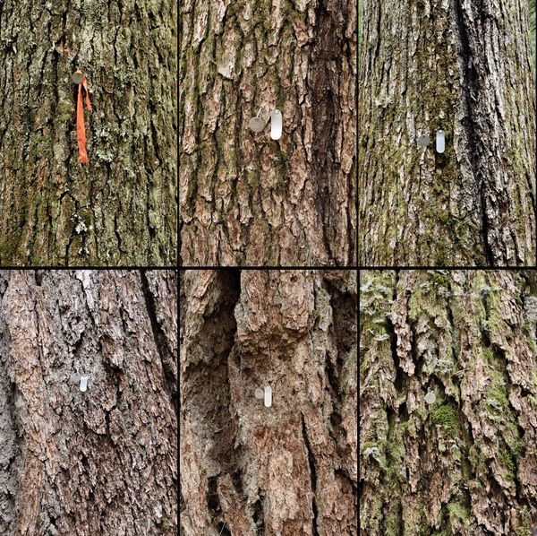 Tagged trees in grid are mounted separately on aluminum, 40” x 26.5”