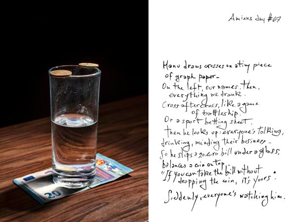 His wife has a lovely face, and they both have green eyes. They met on a chat for people with physical challenges. He had a bad accident. He used to play piano well. Now it’s harder. He turns on the TV and cues his music, so the vacation photos roll by too. He’s a good photographer. Next to the couch, on the little coffee table, everything’s set for a snack, crackers, salami, a French cheese. After a long while, he turns off the TV, takes a drag on his cigarette, blows the smoke hard through his nose, like a bull.