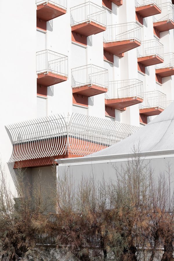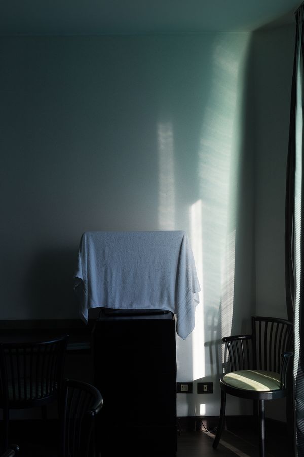 Frozen Rooms: What happens is that even buildings take a long winter’s nap. We're talking about whole towns that fall asleep for a long time, waiting to be awakened by the incoming tourists, quieter and shy the first ones, more intrusive the others. A forced hibernation that leaves the buildings hanging in time and space, cyclically, year after year. A rotation made of preservation rituals that leave the spaces barely recognizable when compared to the high season setup. They are not abandoned, but frozen, they are alive, but moving extremely slowly, almost still. The architectural casing finally appears as it was originally designed, two-dimensional sceneries untouched by human interaction. We investigated this metamorphosis, that nothing can do but silently wait. So we sat down, too, in this great waiting room and look.