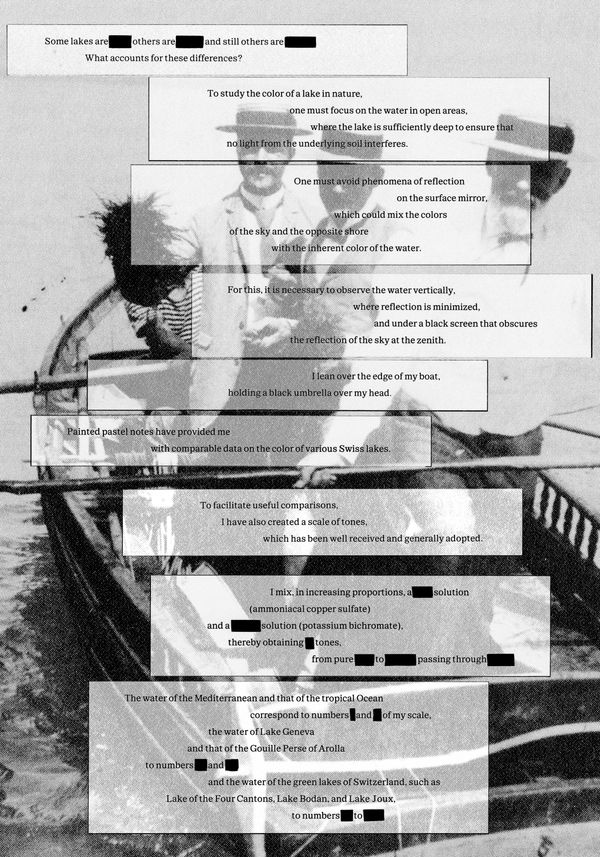The Forel-Ule Index initially consisted of 11 tones. Decades later, it was extended up to 21. Is today’s morphing hydrology going to unveil not 11 or 21, but 42 possible hues? Could the lake Léman turn pink? Could the Pacific Ocean become green? As a trans-temporal dialogue between Forel’s initial studies and contemporary scientific research, the project frames a fictional documentary that speculates with uncertain watery futures. Embodying a connectedness that resonates in post-natural scenarios that bloom in the in-between, as put in the words of Astrida Neimanis, “In-between nature and culture, in-between biology and philosophy, in-between the human and everything we ram ourselves up against, everything we desperately shield ourselves from, everything we throw ourselves into, wrecked and recklessly, watching, amazed, as our skins become thinner.”