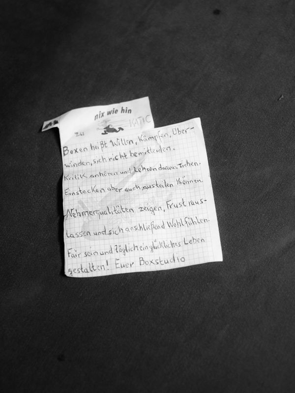 Boxing is often seen as the ultimate embodiment of masculine strength: willpower, endurance, the ability to take hits and strike back are celebrated as core virtues. A note I found on the floor of the boxing club after six months of photographic documentation captures this ideal clearly: