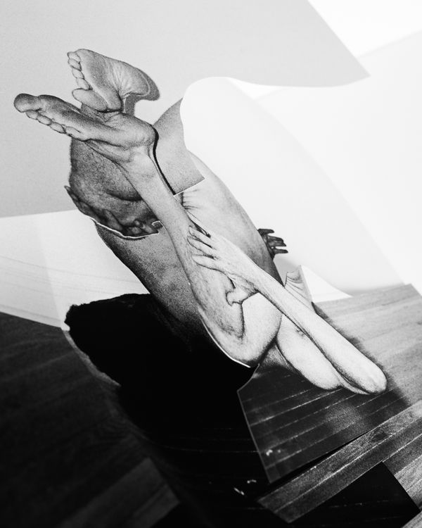 The figure is often captured in an ambiguous black-and-white space of imbalance, existing in both physical and imaginary planes. The re-inserted printed material becomes an extension and breaking apart of the body beyond its own defined parameters, transforming into a mask to emphasize what lies underneath. The series is an intimate collaboration with a close friend, who also happens to be named Paul Simon (Zivkovich), photographing his body as a surrogate for my own. The resulting dysmorphic forms become a site of transformation of the physical and psychological body, demonstrating that sculpture can be crafted in two dimensions.