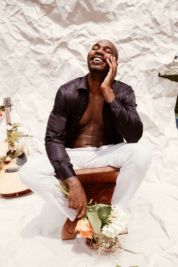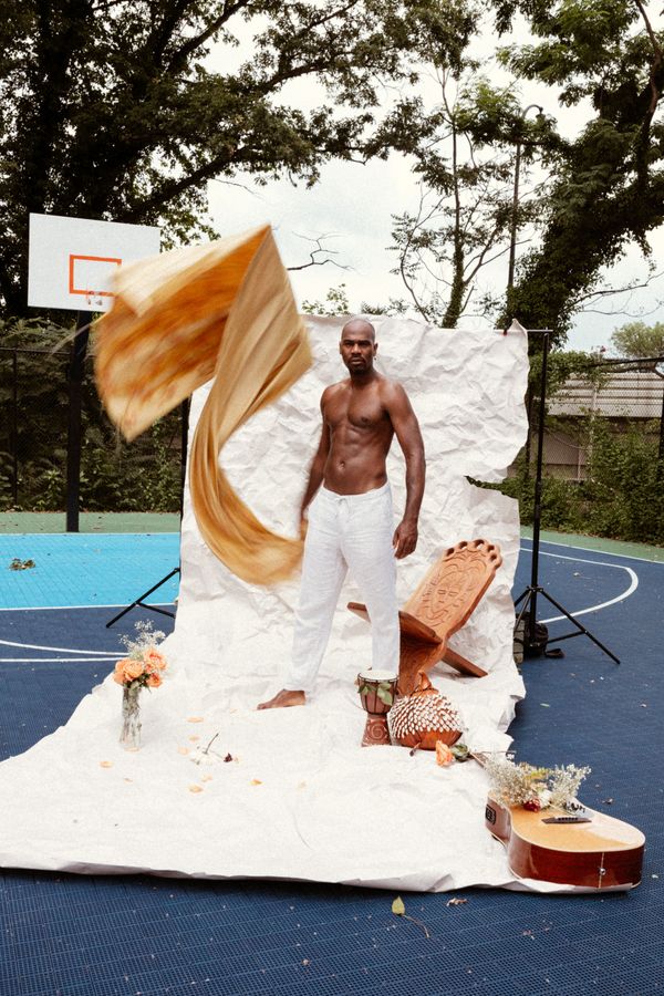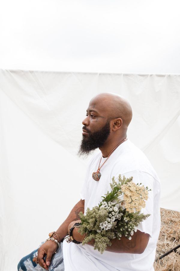 Hunt’s directorial approach to photography by using community members as models is rich in content and symbolism. She employs unique staging techniques such as crumbled seamless paper to draw together her concepts and compositions. A backdrop might add a layer of texture reminiscent of the tough exterior men typically embody; or, a plot of land, very raw and unfinished - under construction. In contrast with feminine movements and energy, the artist presents her subjects in manners that speak to their individual experience and identity. A variety of florals play throughout the series to create a juxtaposition. A simplistic background, with fabrics and soft movements from the subjects, highlights the feminine side of the male and celebrates, not shames, that duality that exists within us all. Each image honors masculinity and the divine feminine as it exists within.