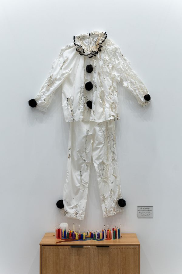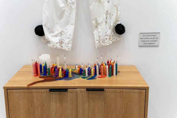 The gallery space is occupied with balloons near the ceiling and confetti on the floor. To the left is a photo of the deceased, the artist’s statement, and mourning pamphlets. Occupying the right wall are 5 framed photographs of Gremmy looking distressed in various locations. The back wall has a wooden buffet table with a variety of colorful melted candles, with Gremmy’s burnt costume displayed above. To the side is a plaque explaining how Gremmy wanted his body disposed of: cremated and turned into confetti.